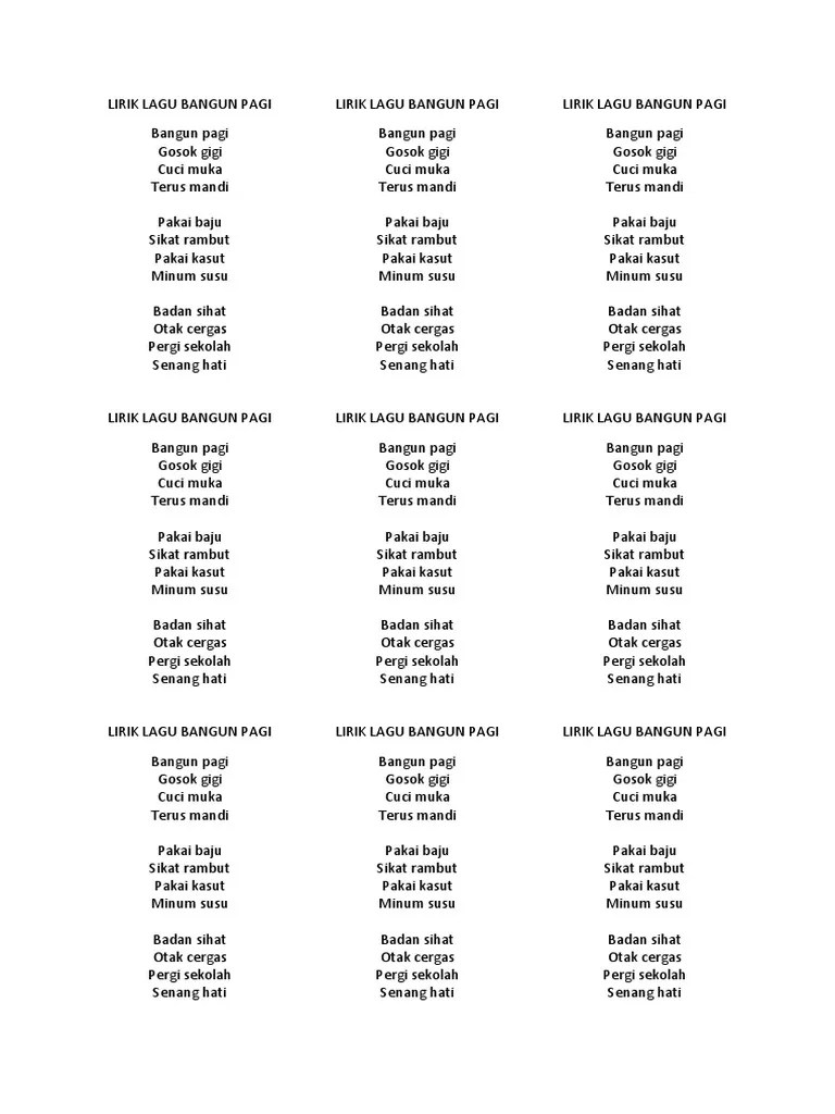 Bangun pagi, gosok gigi, cuci muka, pakai baju, makan roti, minum susu, pergi sekolah, senang hati.